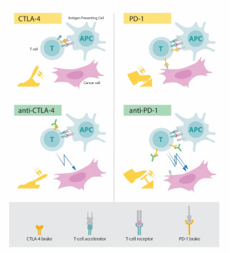 Phía trên bên trái: Kích hoạt các tế bào T khi thụ thể tế bào T gắn với cấu trúc trên các tế bào miễn dịch khác được công nhận là "không tự thân". Một protein hoạt động như một máy gia tốc tế bào T cũng cần thiết cho hoạt hóa tế bào T. CTLA- 4 hoạt động như một “phanh” trên các tế bào T ức chế chức năng của máy gia tốc.